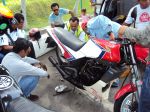 Anything happen on the ride? Some of bike have problem such as punchure, CDI problem, Magnet coil burn, connecting rod jamm due to lack of 2T oil, bearing crank shaft jamm due to 2T pump malfunction, Liquid coolant overheat, exhaust crack. Some problem solved but some problem can't by our mechanic. So, towing no choice.